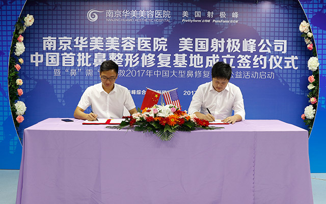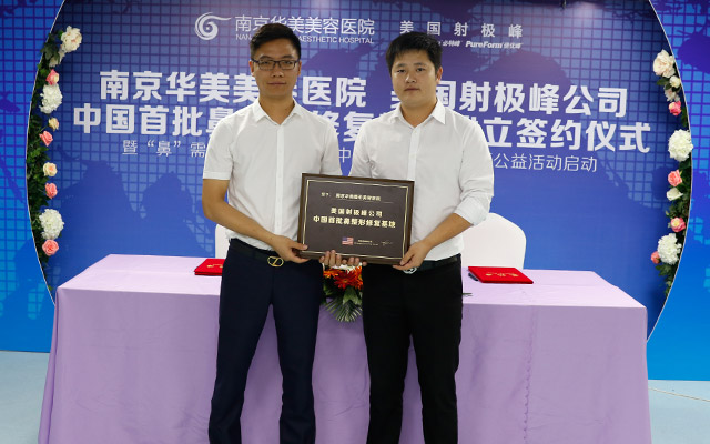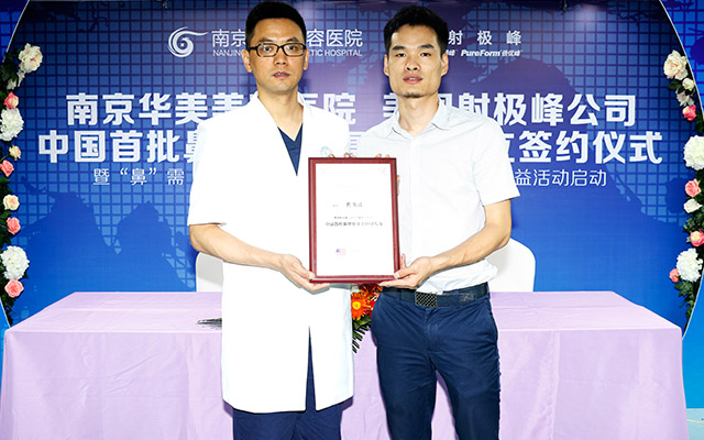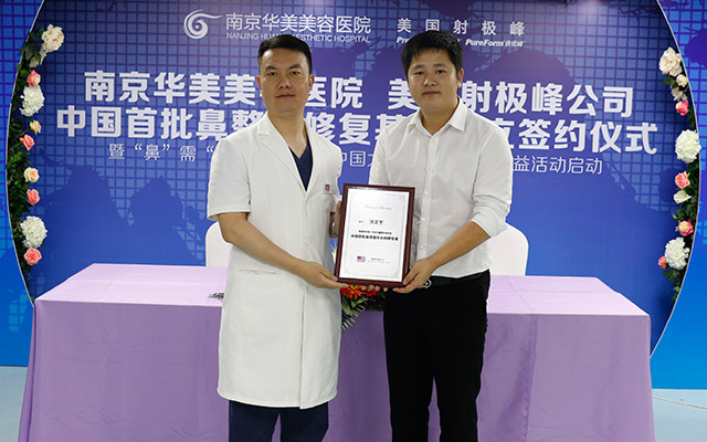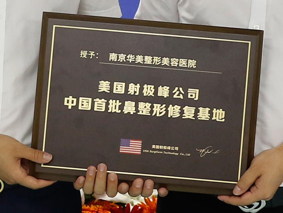 签约仪式当天,美国射极峰公司领导亲临华美授牌。一直以来,南京华美致力于鼻整形研究与探索。这次能从全国众多医疗机构中脱颖而出,成为“中国首批鼻整形修复基地”之一,这对华美来说是一个巨大的肯定,它将鞭策着我们不断前进。