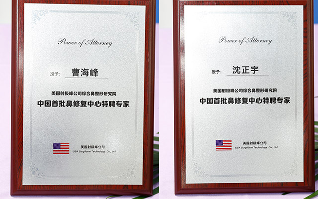 除此之外,华美隆鼻专家沈正宇院长和曹海峰院长也被射极峰公司授予为“中国首批鼻修复中心特聘专家”。两位院长多年来始终专注于鼻整形,其精湛的技术受到了行业内外的一致好评,这次被授予为“中国首批鼻修复中心特聘专家”,可谓实至名归。