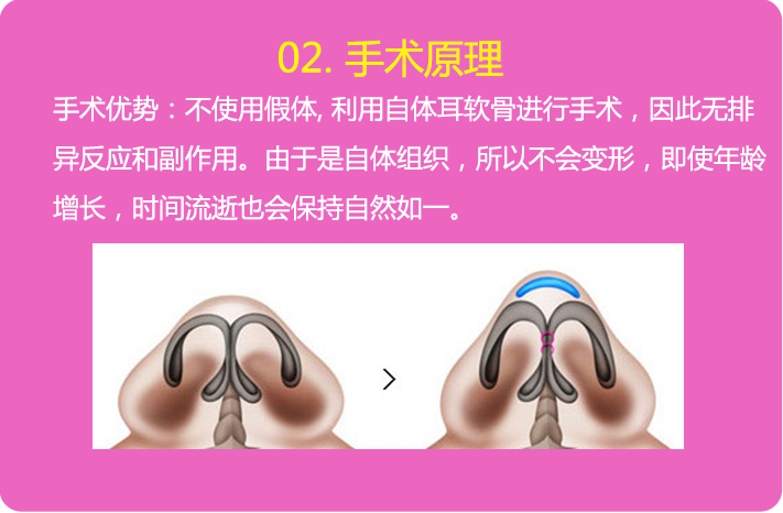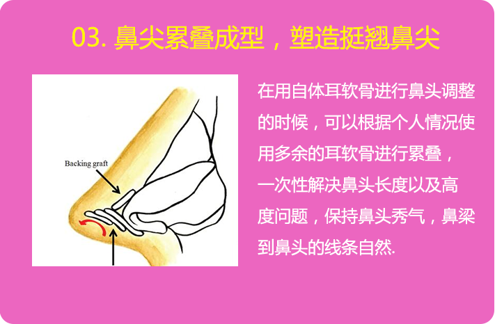 耳软骨是塑造自然鼻尖的好材料,是容易提取的软骨。形状与鼻子的形状相似,弹性好,用耳软骨来垫鼻尖可以塑造更加自然的鼻尖。