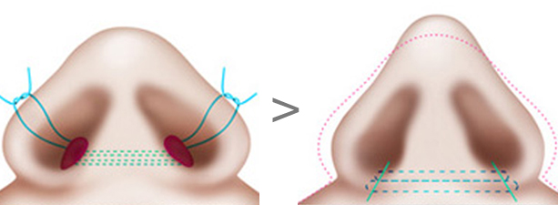 采用鼻中隔软骨或肋软骨,对鼻翼软骨进行支撑,从而有效改善塌鼻和鼻翼宽症状