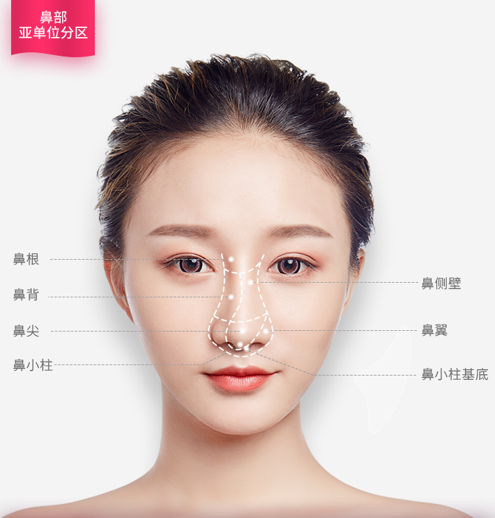 将鼻部各单位精细分区,从细微处考量东方人的鼻部外形、各个亚单位 的形态,结合东方的审美观念、时尚美学参数以及五官协调、个人气质 等,为您打造具有美感、个性特色的俏丽美鼻