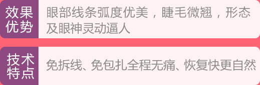 采用华美专利缝合技术,不需要拆线换药、术后包扎,术后肿胀减小,恢复更快,不影响工作生活。眼睛睫毛微微上翘,更具灵气。